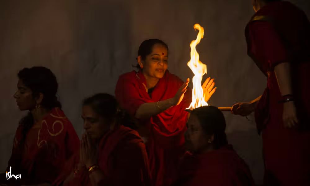 Без огня невозможно установить никакого союза: ни физического, ни эмоционального, ни духовного. Если некая форма, будь то изображение или божество, излучает определённую энергию, то огонь является хорошим средством, чтобы сделать себя доступным для неё. Вы увидите, что, если люди находятся в храме Линга Бхайрави, они совершают арати с огнём, чтобы установить с ней связь. Дело не в том, что она не может установить связь без огня — она может, но это делается для того, чтобы сделать вас более восприимчивыми к этому. Акаш вокруг огня, горящего возле божества, приобретает качество Божественного. Поэтому, когда вам подносят его, вы не опускаете руку в огонь; вы лишь берете Акаш вокруг него и прикладываете к глазам, или к макушке головы, или к сердцу. Вы пытаетесь взять какую-то частицу Божественного для своей пользы, взять его и сделать частью себя. Весь процесс Арати работает в этом направлении. Всё это может помочь человеку постепенно развить свой собственный огонь.