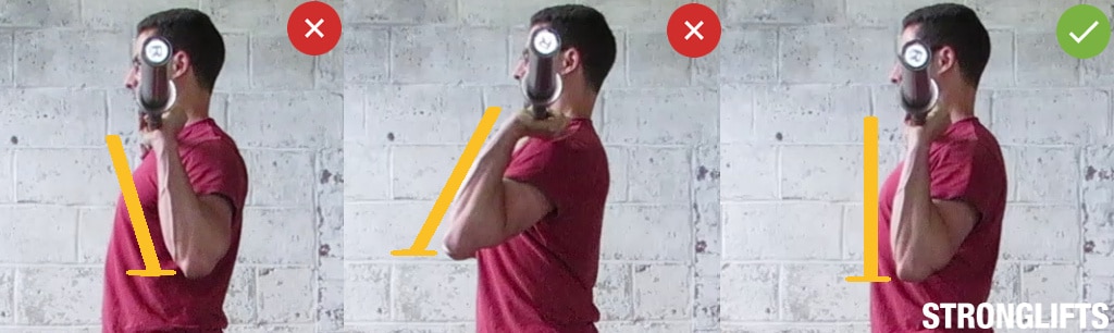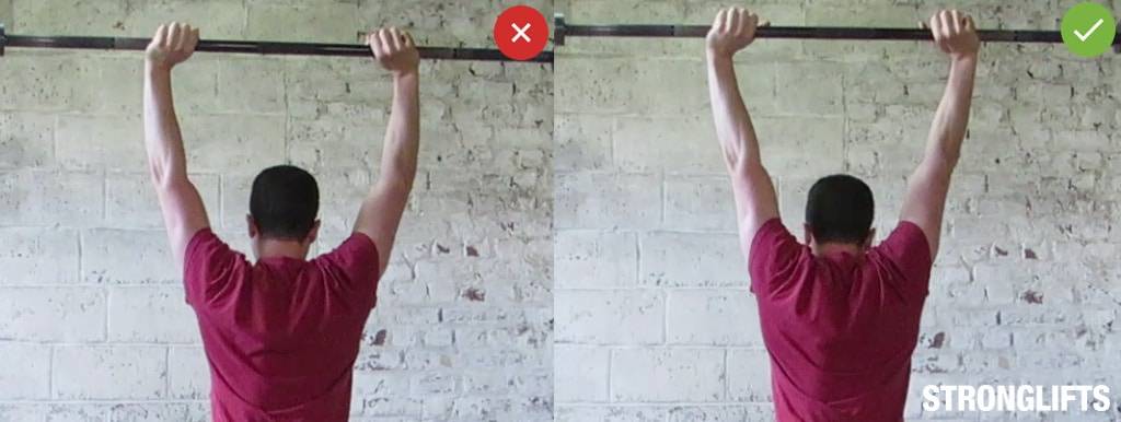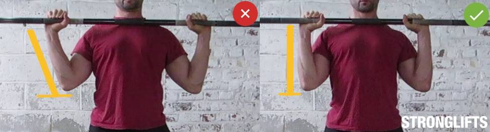 В нижней точке траектории локти должны быть направлены в пол (а не быть расставленными в стороны или выходить вперед). Кисть не должна быть заломлена ни вперед, ни назад — то есть, вес штанги должен поддерживаться именно запястьем. Если вы не можете держать штангу подобным образом, значит ее вес слишком велик.