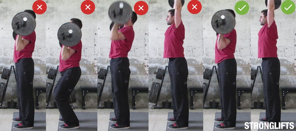 Во время подъема штанги ноги должны плотно стоять на полу, а колени не должны сгибаться — вы не должны пытаться вытолкнуть штангу вверх при помощи приседаний. Мышцы пресса необходимо поддерживать в осознанном напряжении — это защитит позвоночник и низ спины, а также поможет в укреплении мускулатуры корпуса.
