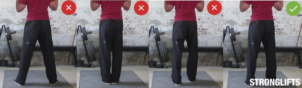Встаньте перед стойкой, штанга находится на креплениях примерно на высоте плеч. Ноги расставлены по ширине бедер, колени смотрят вперед, ступни плотно стоят на полу и слегка открыты (но не более, чем на 15°). Следите за тем, чтобы ноги находились на одной линии, и одна нога не выходила вперед или назад.