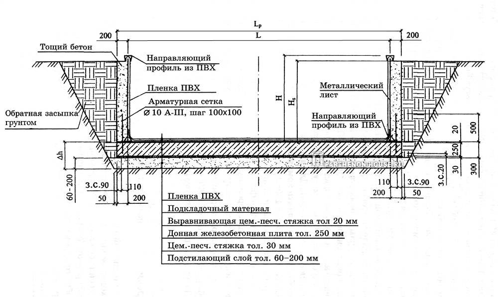 Полноценный бассейн с размерами 3х4 метра и глубиной 1,4 м дает нагрузку на грунт не менее 17 тонн. Чем больше высота столба жидкости, тем значительнее давление на почву. К этому нужно добавить собственный вес рукотворного водоема, сантехнического оборудования, отделочных материалов. Поэтому под купель устраивают достаточно мощный фундамент из монолитного железобетона.