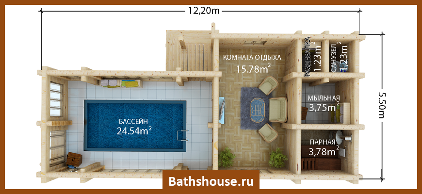Проект бассейна в банном комплексе предусматривает такие возможности: