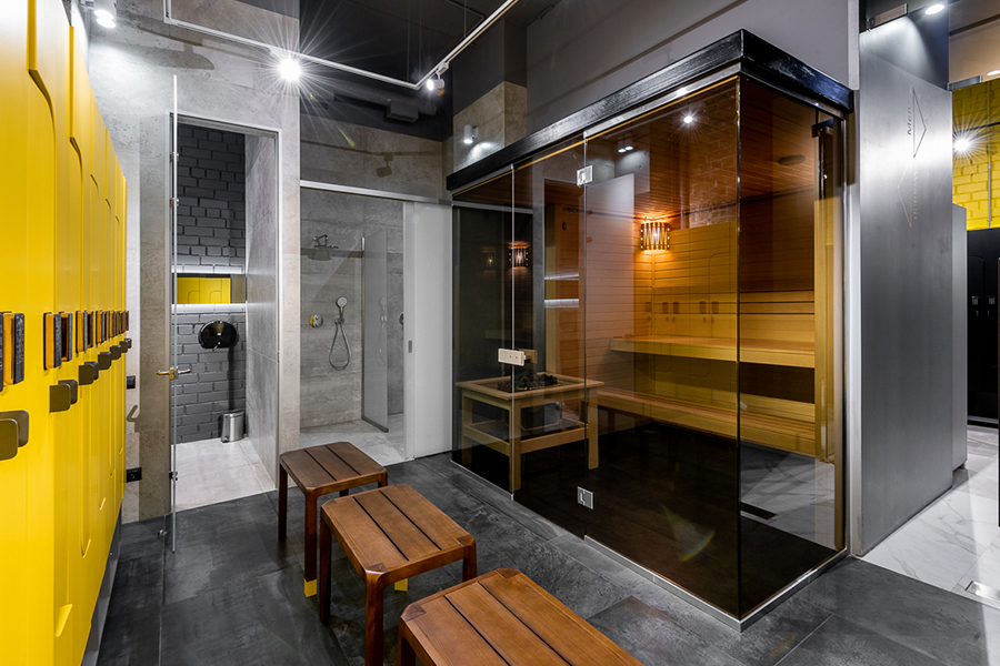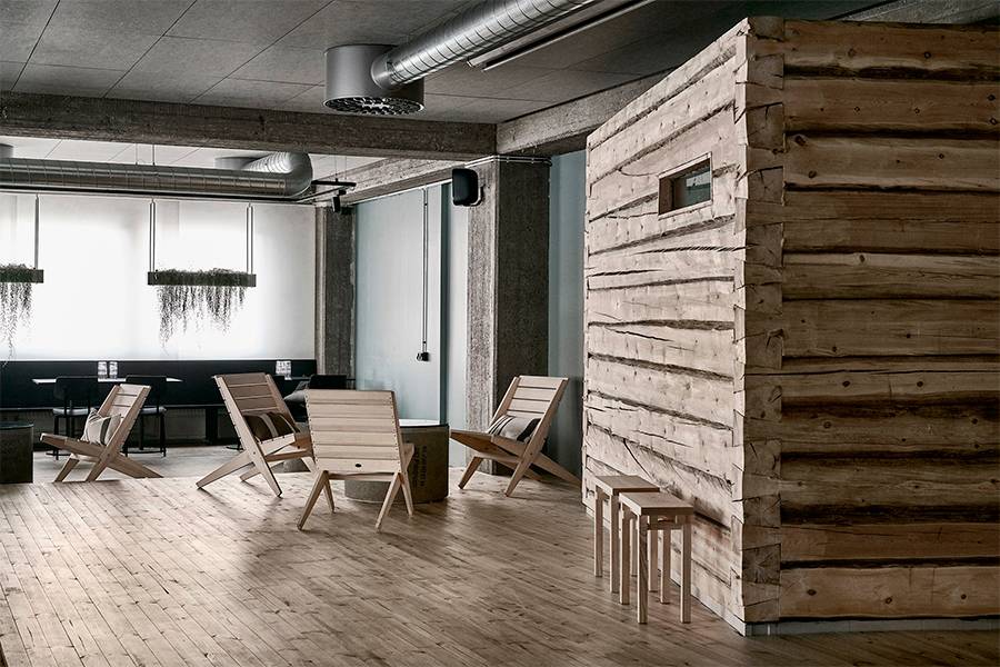 Баня располагается в постройке типа цех, завод или склад. Будущий дизайн бани отталкивается от внешнего вида здания: стены выполнены из кирпича, высокие потолки, большие окна, люстры с лампами накаливания. Основной акцент указывается на индустриальное прошлое помещения. Мебель выполнена в минималистичном стиле.
