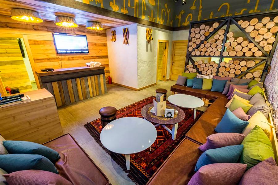 Потолок украшен люстрами с лампами накаливания. Установлены балки перекрытия, которые удерживают крышу. Используются хамам скамейки, обложенные мелкой мозаичной плиткой.