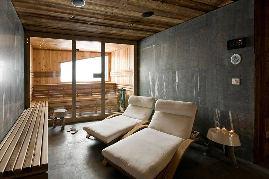 Домашняя баня в стиле лофт делается с упором на Hi-tech тематику. Часто имеет внешний вид шале. Постройка начинается с предбанника: кожаный черный диван, небольшой металлический столик, камин обложенный камнем. Плитка на стенах не является грубым нарушением в оформлении домашней бани.
