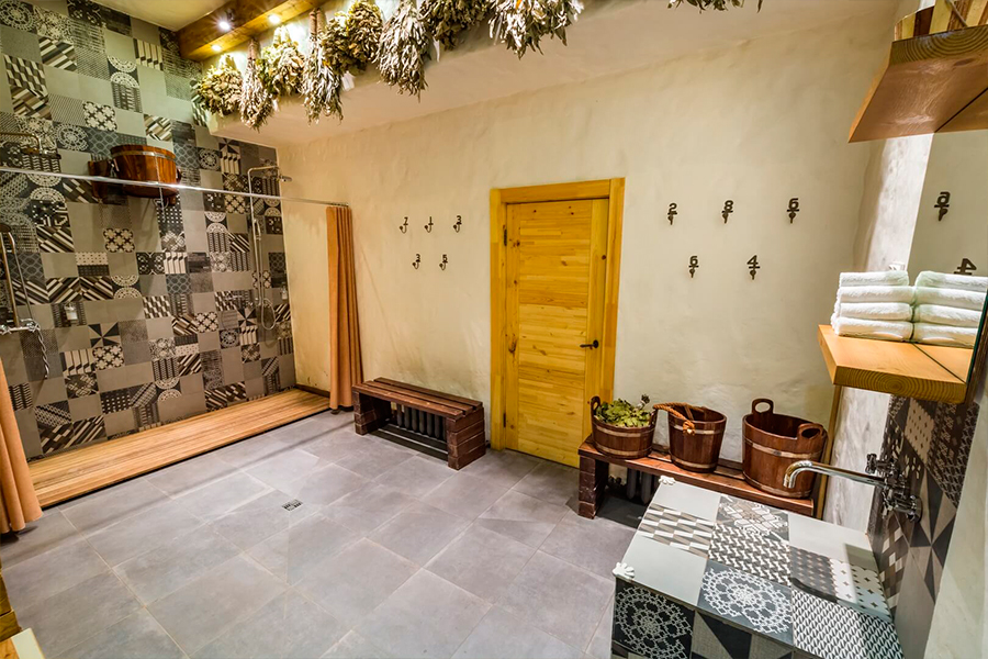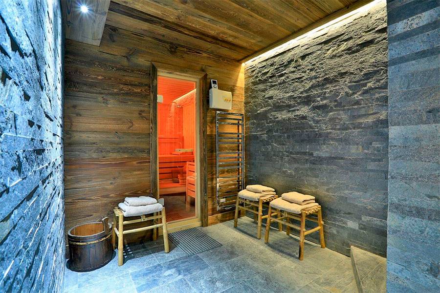 Подобное дизайнерское решение требует большого вложения денег. Это оправдано, если идет речь про баню общественного пользования. В домашней бане можно использовать заменители дорогостоящих стройматериалов.