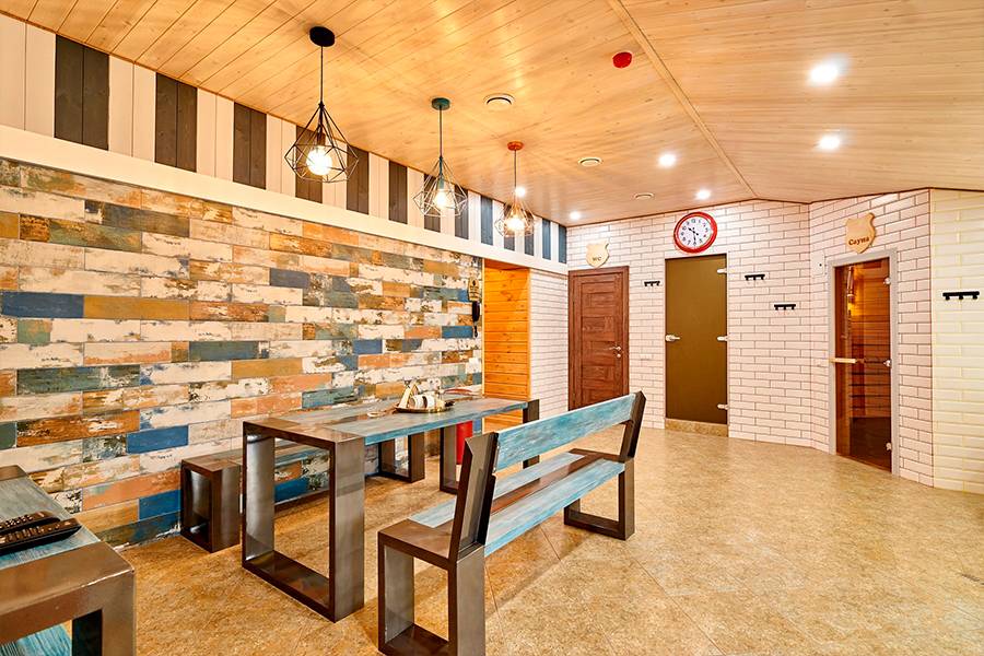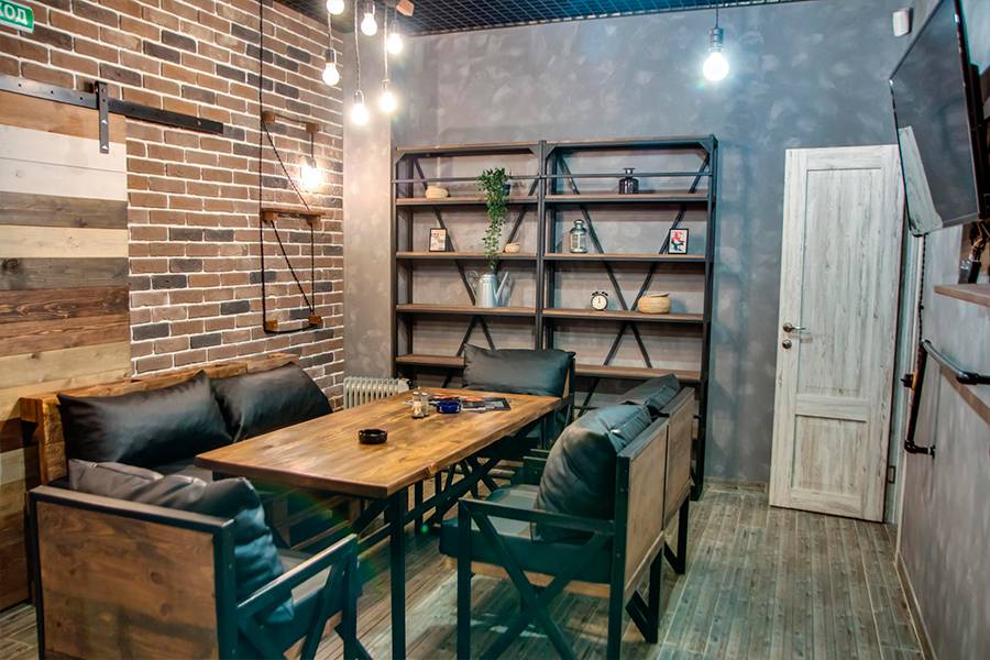 Баня в стиле лофт начинается с общего зала, где можно записаться на процедуры. Стены зала выполнены из кирпича с нанесенным искусственным устареванием. Интерьер состоит из мягких диванов, кресел, стульев, небольших столов.
