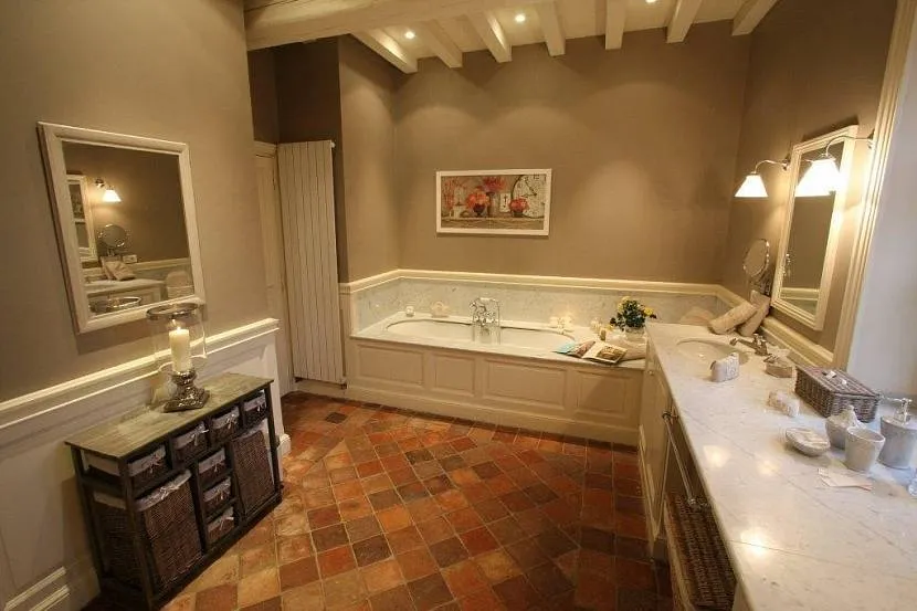 Если вам нравятся ванные комнаты во французском стиле, то стоит ее сделать в светлых тонах. Также этому стилю присущи большие окна, через которые будет проникать яркий дневной свет, и придавать помещению особой воздушности. Данный интерьер приближен к классическому стилю и в нем превалируют светлые оттенки, такие как: