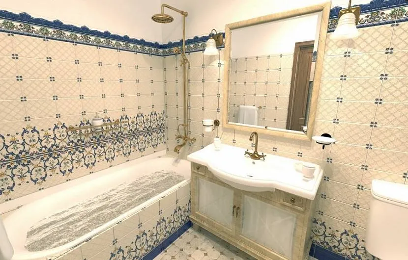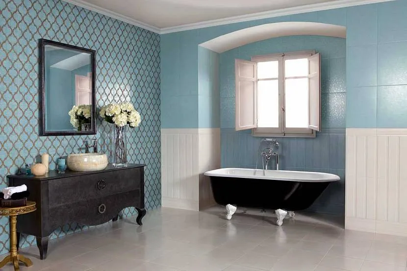 Главной в этом помещении должна стать ванная в каноническом стиле. А вот душевая кабина здесь будет неуместной. Плитку следует выбирать пастельных оттенков. Идеально, если она будет матовой. Отделать ею можно только нижнюю часть стены, в то время как верх просто выкрашиваются белой краской или декорируются штукатуркой.