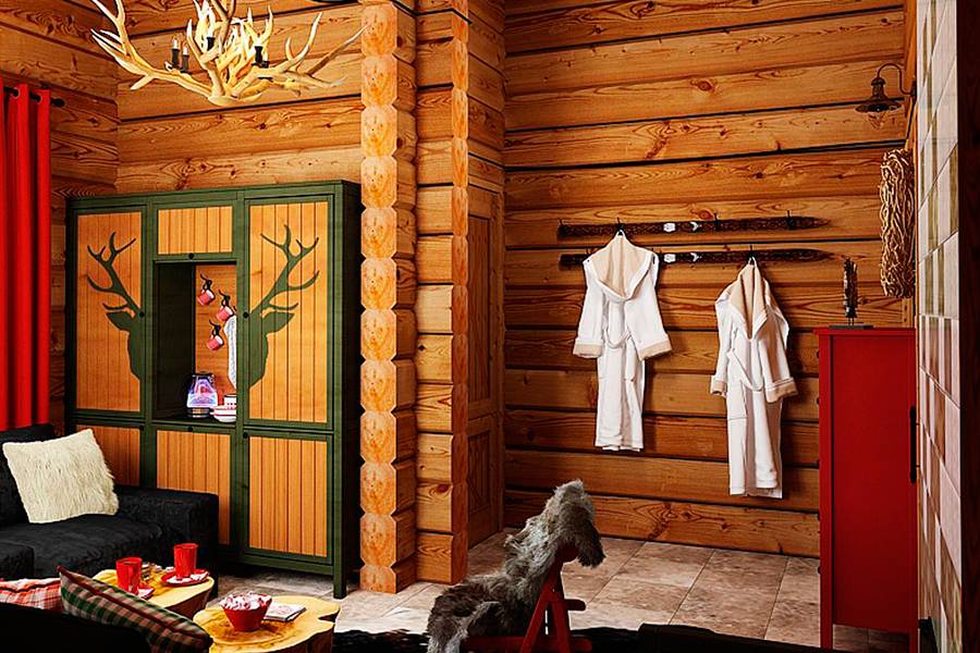 Для оформления интерьеров бани в стиле шале используют деревянные отделочные материалы: доски, вагонку, блок-хаус, имитацию бруса. Все эти материалы обрабатываются специальными пропитками, защищающими их от воздействия влаги, перепадов температуры и гниения. Интерьеру комнаты отдыха придают женский или мужской характер. Это достигается с помощью декора.
