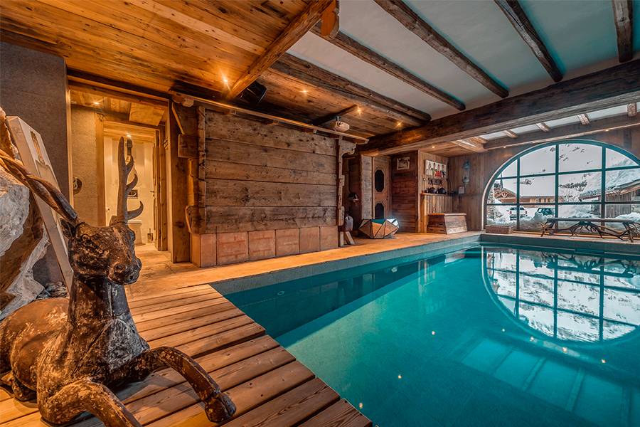 Проекты шале предполагают применение тяжелых деревянных дверей. Их украшают резьбой, венками из высушенных душистых трав. Полом служат некрашеные массивные доски, покрытые лаком (или морилкой). Иногда дерево искусственно состаривают. Полы принято украшать коврами и шкурами животных.