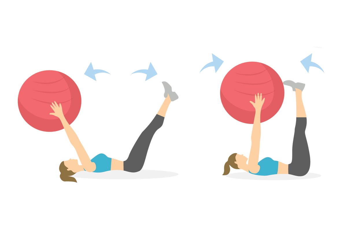 Упражнение для укрепления нижнего пресса и мышц задней поверхности бедер. Лежа на спине, на выдохе отведите руки с мячом назад, одновременно опуская ноги, на вдохе выполните скручивание — медленно и с ощущением напряжения мышц живота.