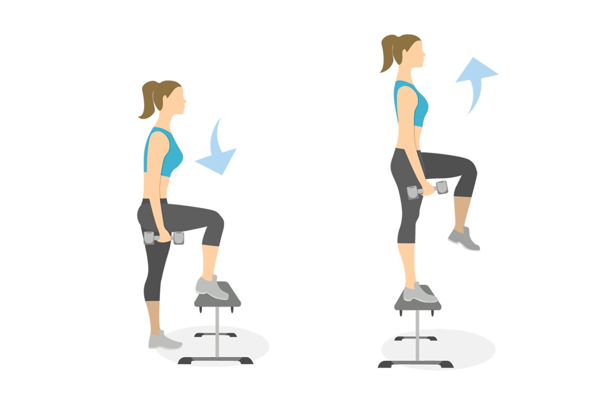 Упражнение для развития чувства равновесия и для укрепления пресса и ягодиц — в частности, средней ягодичной мышцы, придающей характерную округлость. На выдохе поднимите согнутую в колене ногу вверх, на вдохе опустите вниз. Следите за тем, чтобы таз и плечи были неподвижны.