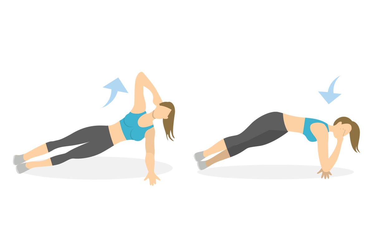 Крайне эффективное упражнение для укрепления боковых мышц живота и создания подтянутого пресса. Полезно как для развития равновесия и улучшения осанки, так и для уменьшения размера талии. Исходное положение — боковая планка с заложенной за голову рукой, затем локоть тянется вниз.