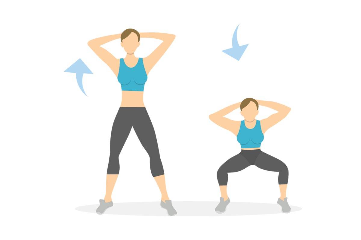 Упражнение для разминки. Заложите руки за голову, напрягите пресс и ягодицы, затем, на выдохе, медленно опуститесь вниз — словно садясь на стул. Следите за тем, чтобы колени не выходили вперед. Задержитесь на 1-2 сек и поднимитесь вверх.