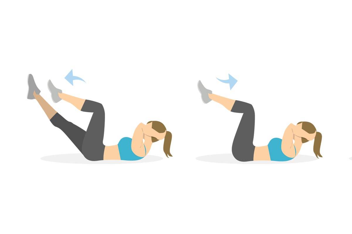 Велосипед — одно из ключевых упражнений для укрепления боковых и поперечных мышц живота. Во время попеременного движения ногами держите живот втянутым, пресс напряженным, а также не отрывайте поясницу от пола.