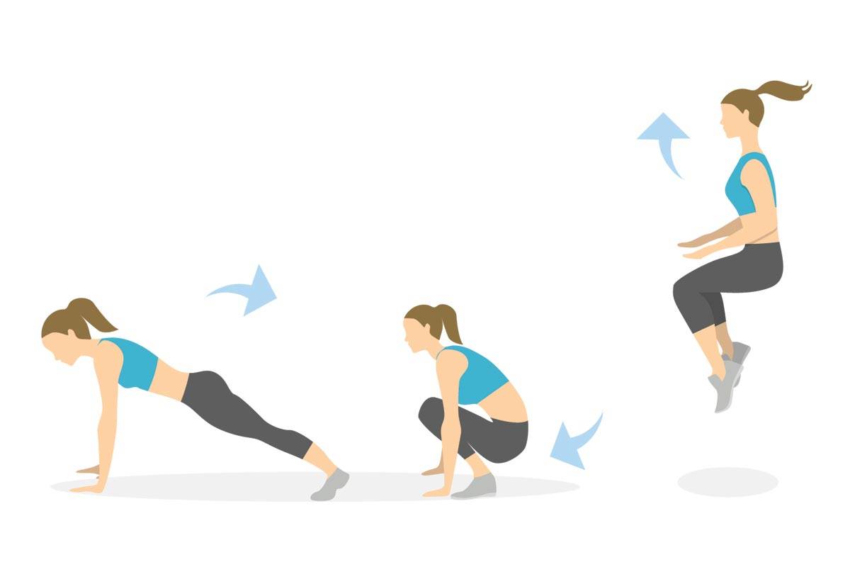 Бёрпи (упор-присед с выпрыгиванием вверх) — одно из наиболее энергозатратных упражнений и лучший инструмент сжигания жира с живота и боков. Представляет из себя комбинацию четырех движений, вовлекающих в работу практически все мышцы тела.