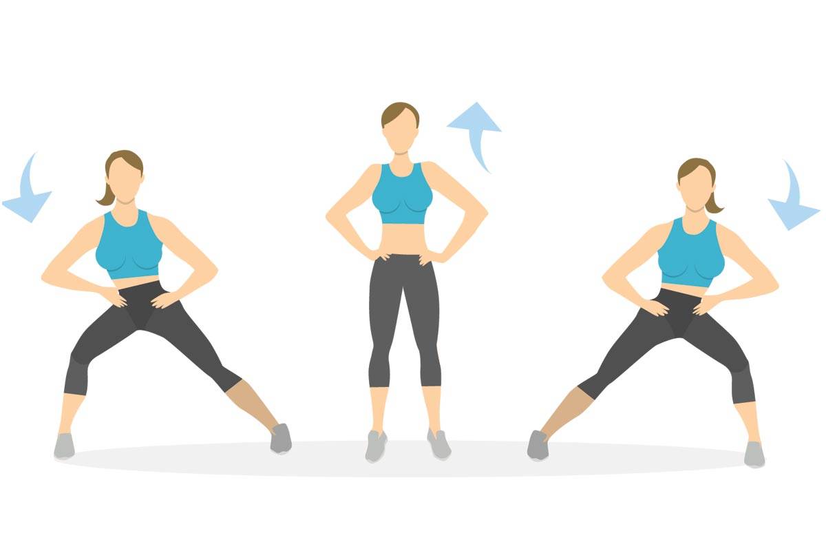 Упражнение для косых мышц живота, ягодиц и мышц бедер. Сделайте шаг правой ногой в сторону, затем, на выдохе, опуститесь вниз. На вдохе вернитесь назад. Повторите для другой ноги. Держите пресс в напряжении. Выполняйте упражнение в быстром темпе, однако следя за техникой.