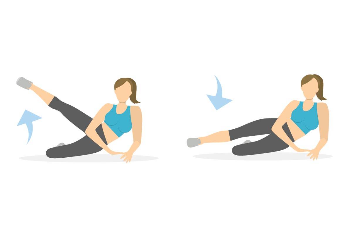Из полулежачего положения медленно поднимите прямую ногу вверх, чувствуя работу бокового пресса и мышц ягодиц. На выдохе опустите ногу вниз — затем, без касания пола, снова поднимите ее вверх. Следите за тем, чтобы мышцы живота находились в осознанном напряжении.