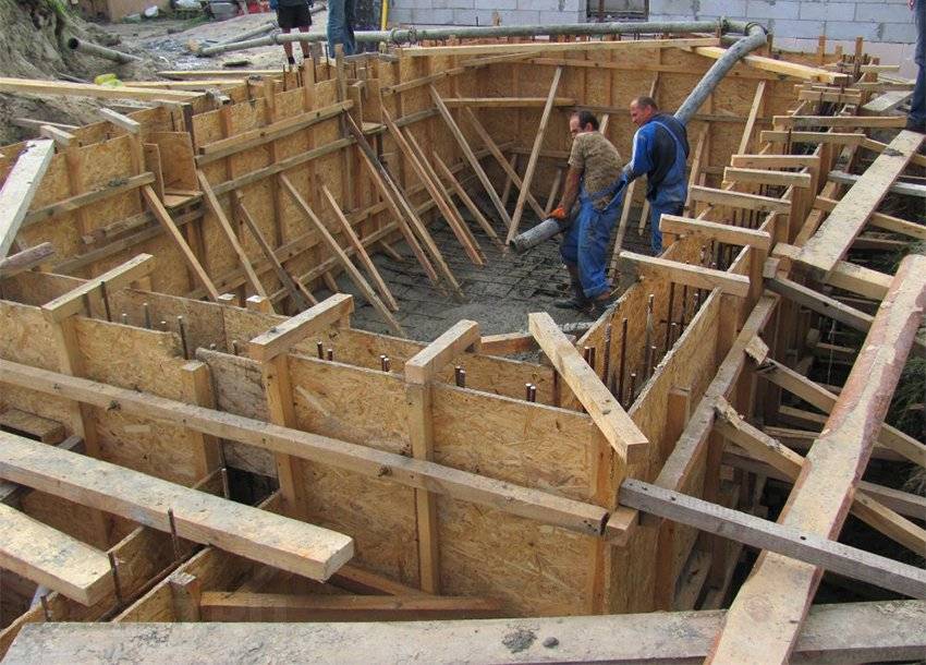 Процесс строительства бетонного бассейна заключается в установке опалубки и заливке бетона. В зависимости от расположения и других особенностей резервуара, техника выполнения работ может иметь свои особенности.