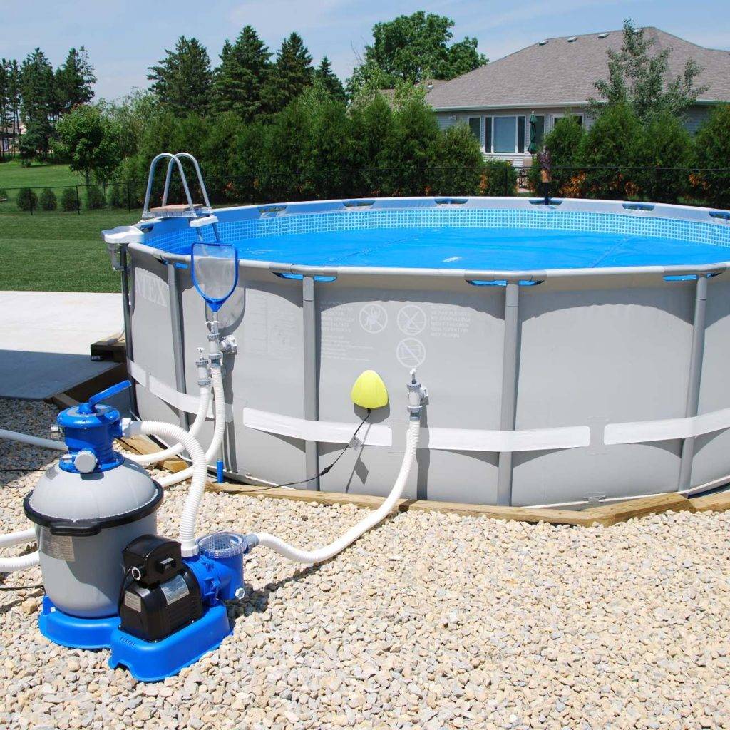 Минимальный набор, который потребуется для поддержания чистоты в надувном бассейне — фильтр-насос и скиммер для очистки воды от крупного мусора. Не стоит отказываться и от чехла, который будет защищать воду в перерывах между купаниями.