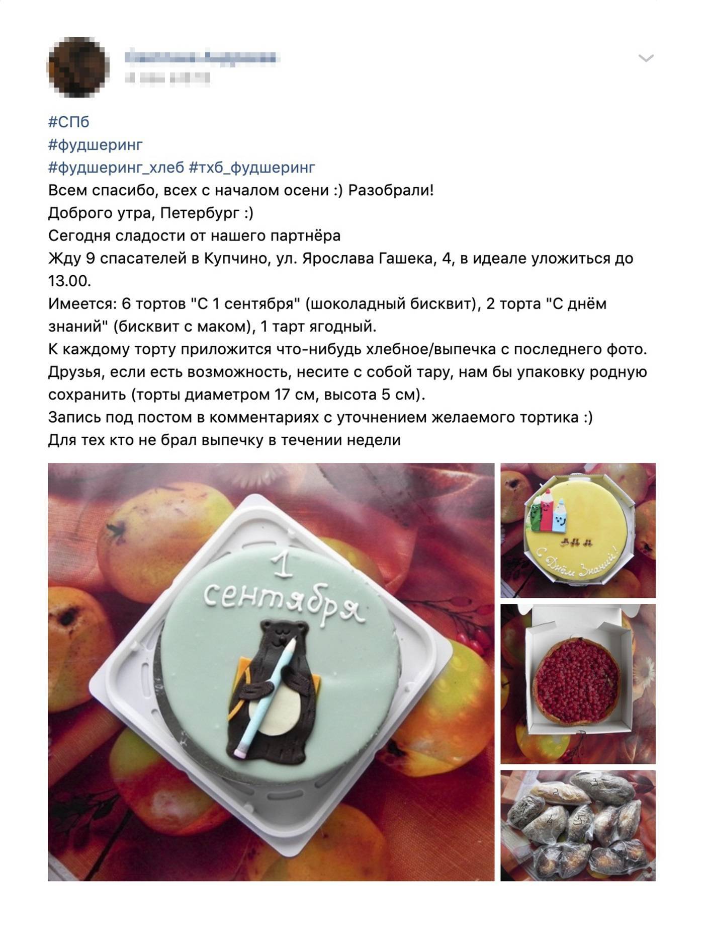 Группы фудшеринга. Актуально для Петербурга и Москвы. В других городах движение пока еще не настолько развито: группы фудшеринга существуют, но популярностью не пользуются. В Великом Новгороде мама с июля пытается отдать через группу фудшеринга замороженные ягоды с огорода на компот — пока безрезультатно.