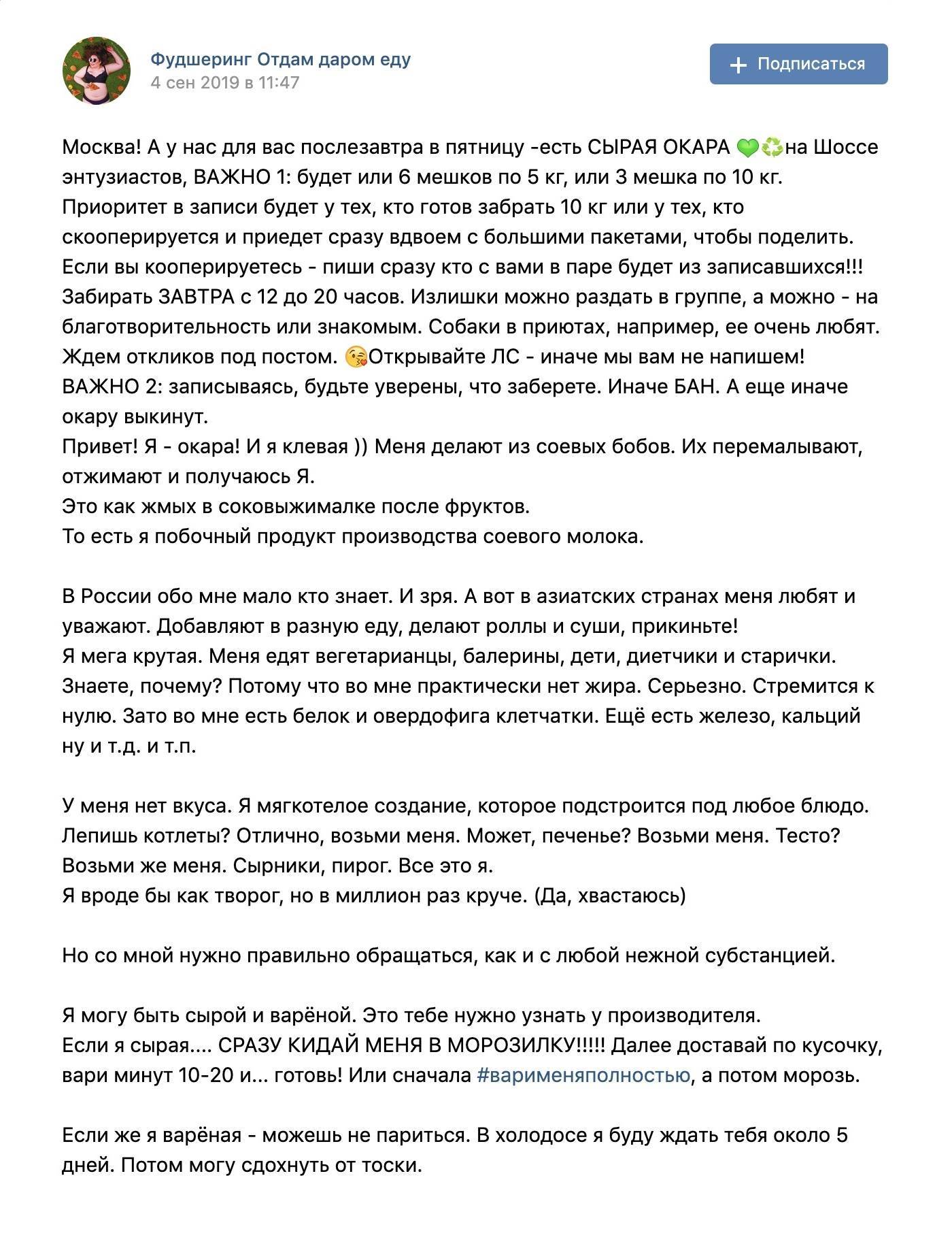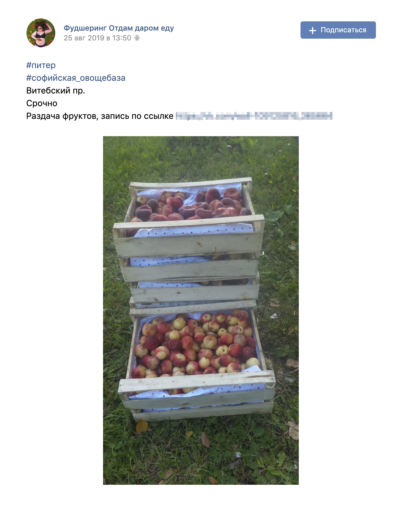 Чтобы отдать еду через группу, нужно опубликовать пост с фотографией и коротким текстом. В тексте указывают, в каком городе и на каких условиях готовы отдать еду: в свою тару или нет, нужна ли сумка. Обмен на деньги или на что-то другое не предусматривается.