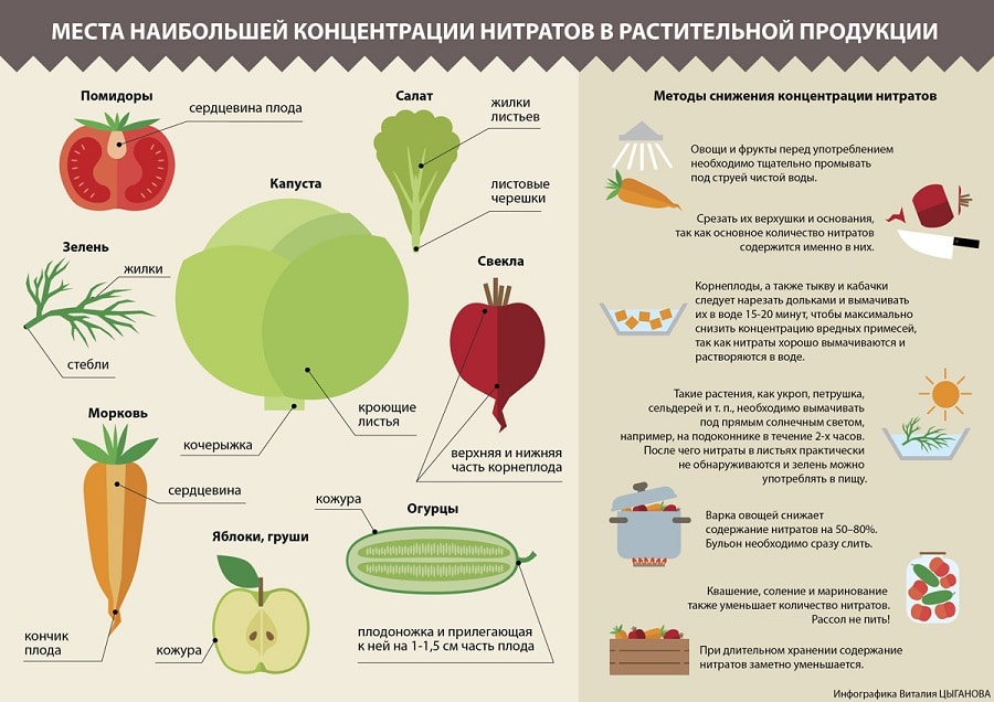 Больше всего нитратов – в зонах роста плодов, где происходит синтез белка. Например, в кочерыжке и верхних листах капусты, в кожуре картошки, хвостиках огурцов. Потому их рекомендуется счищать, отрезать и не использовать в пищу.