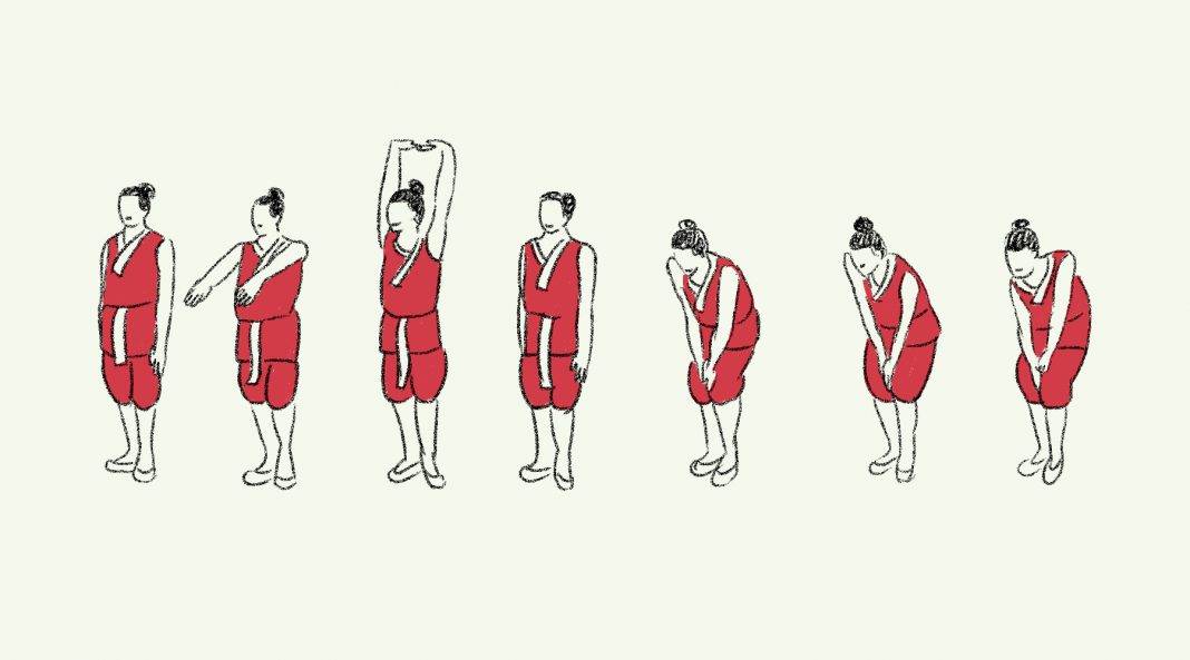 Исходное положение всех позиций — ноги на ширине плеч, руки опущены по бокам тела, дыхание глубокое, мышцы расслаблены. Упражнения следует делать по 8 раз в обе стороны.