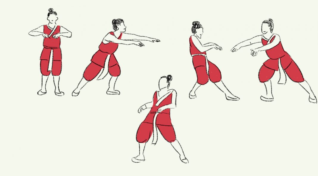 Наклоняем корпус влево, тянем руки вперед. Левую ногу вперед на половину шага. Затем двигаем руки перед грудью влево-вправо по горизонтали. Туловище одновременно перемещается направо-назад. Сделали восемь раз, после чего поставили вперед правую ногу. Руки движутся по кругу в обратном направлении.