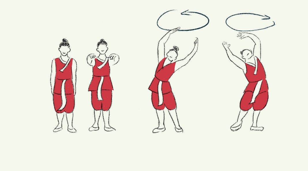 Руки вытяните вверх, ладони поверните друг к другу. Спину нужно расслабить и немного наклониться назад в области грудной клетки. Вращайте руками и верхней частью корпуса четыре раза влево, затем четыре раза вправо.
