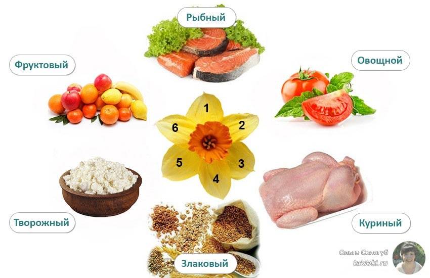 Меню диеты шесть лепестков опирается на использовании шести групп продуктов питания.