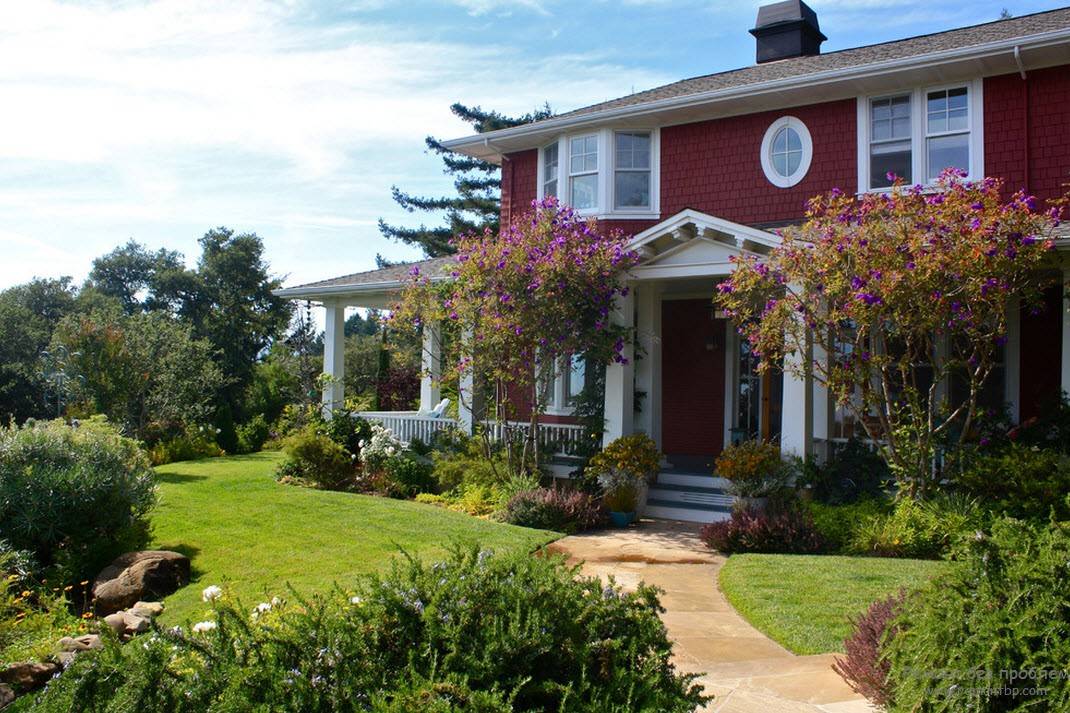 Также не следует забывать о том, что дизайн обустроенной территории должен прекрасно гармонировать с самим домом. Другими словами, стиль дизайна дома и двора должны обязательно совпадать Добиться этого легче, если участок небольшой. А если вы располагаете просторным большим двором, то не стоит организовывать, к примеру, восточный садик или любой другой уголок другого стиля вблизи дома. В таком случае его следует расположить в отдалении, т.к. доминанта всей композиции и всего дизайна – сам дом, т.е. здание дома – это фокусная точка. Причем, необходимо учитывать даже то, как будет выглядеть эта точка с разных ракурсов. А парадный путь непременно должен пролегать прямо от ворот до главного входа.