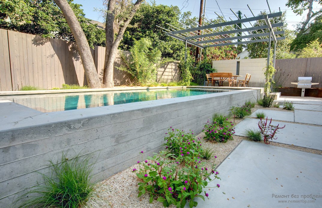 Преимуществом таких бассейнов для ландшафтного дизайна является то, что их формы не имеют ограничений, к тому же они прочны и способны служить 10 лет и более. Такая конструкция не будет возвышаться над поверхностью и не будет заметна, поэтому не повредит внешнему виду участка.