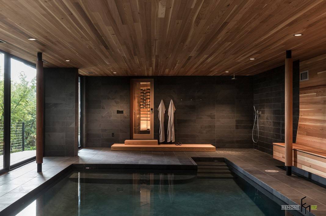 В дизайне этого просторного помещения для бассейна использован классический прием гармоничного сочетания прохлады темно-серого гранита с теплотой древесных оттенков отделки потолка и части стены.