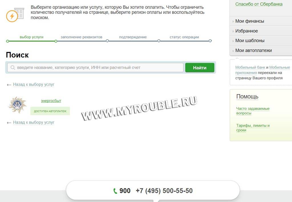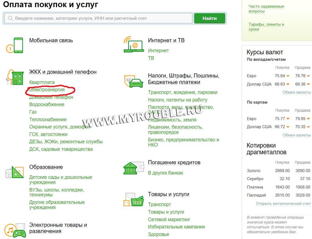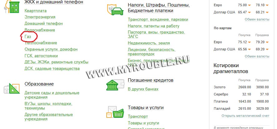 На открывшейся странице перед вами будет список ваших карт и их баланс. Вверху странички есть меню. В нем выбираем «Платежи и переводы». Далее вы увидите раздел «Оплата покупок и услуг», в котором указаны все варианты организаций, чьи услуги доступны для оплаты. Здесь возможна оплата по отдельности – свет, газ, телефон, вода и т. д.