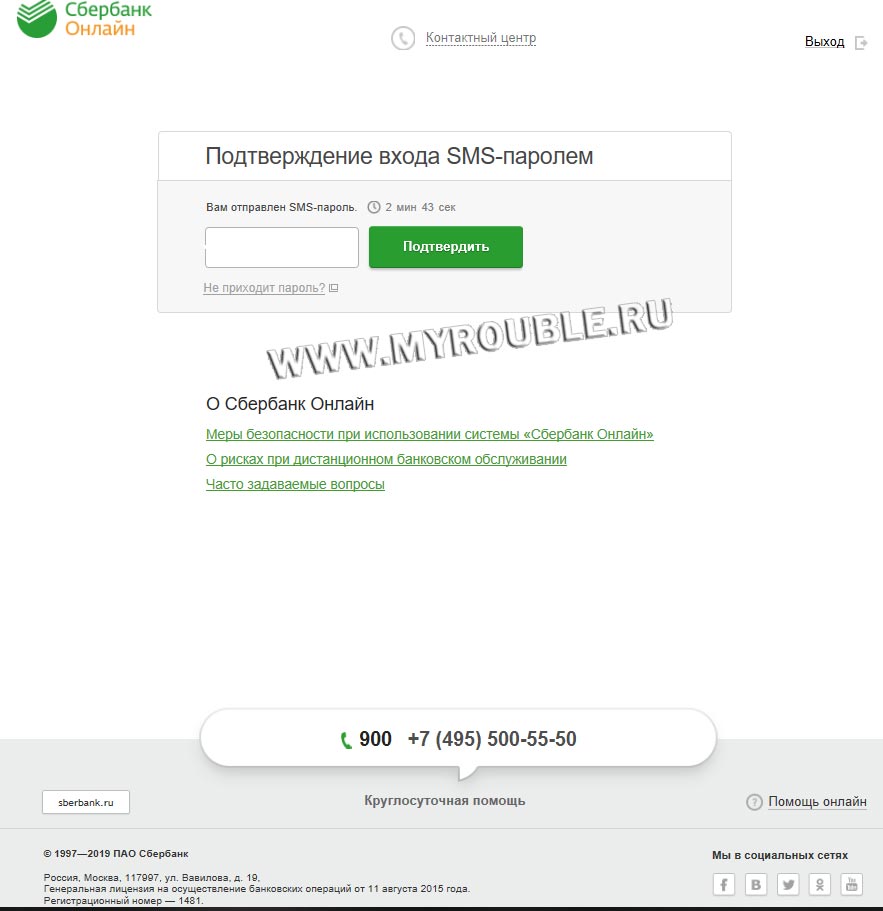 В течение минуты поступит код подтверждения в SMS. Введите его
