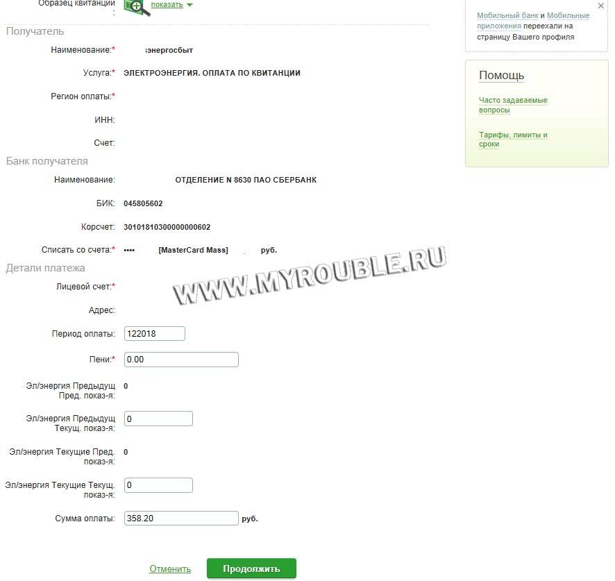 Введите последние показания счетчика электроэнергии, общую сумму к оплате и нажмите кнопку Продолжить.