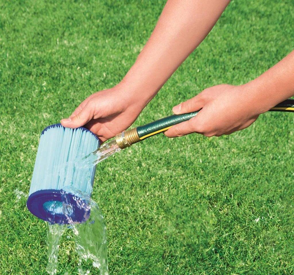 Картриджный фильтрующий насос не только подает воду в бассейн, но и задерживает крупные загрязняющие фракции (съёмный картридж нужно время от времени промывать и менять).