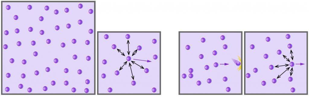 - Столкновения между отдельными частицами и между частицами и стенками сосудов носят абсолютно упругий характер, то есть количество движения и кинетическая энергия до и после столкновения сохраняется.