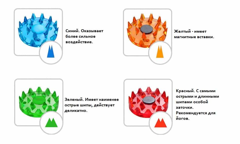 Все аппликаторы Кузнецова отличаются друг от друга цветами игольчатых дисков. Каждый цвет соответствует остроте иголок на пластине: