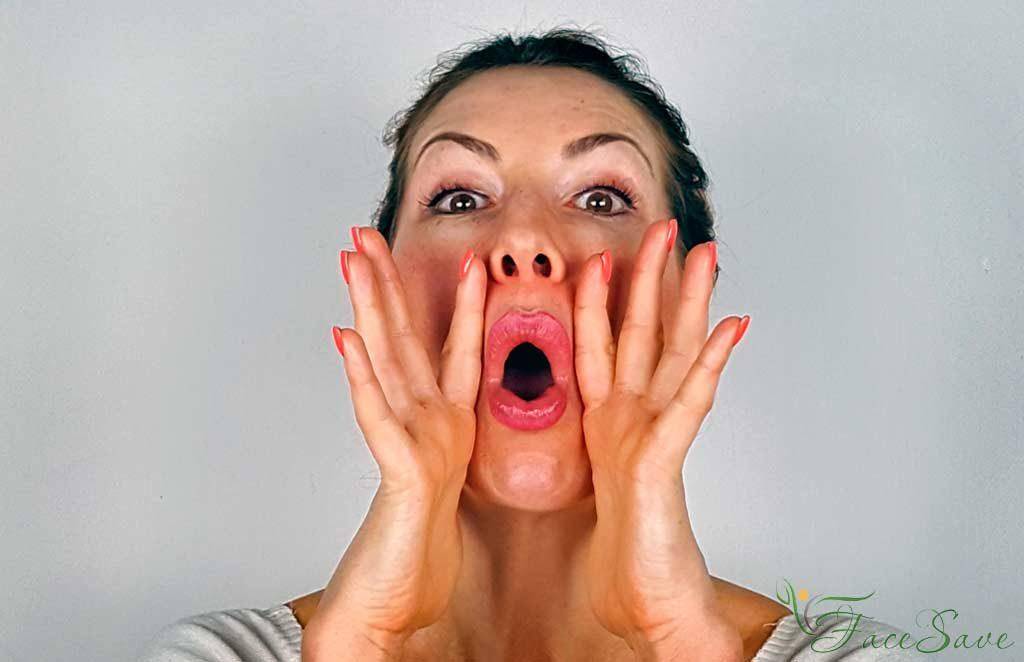 3 упражнение. В таком же положении устанавливаем средний и указательный палец на скулы. Вытягиваем губы трубочкой, как будто говорим букву “О”. Затем мы напрягаем скуловые мышцы и пальцами направляем их вверх.