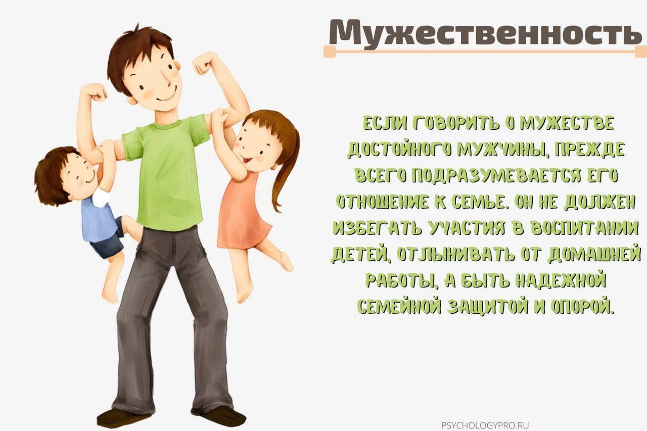 Мужественность — понятие достаточно широкое. Если говорить о мужестве достойного мужчины, прежде всего подразумевается его отношение к семье. Он не должен избегать участия в воспитании детей, отлынивать от домашней работы, а быть надежной семейной защитой и опорой.