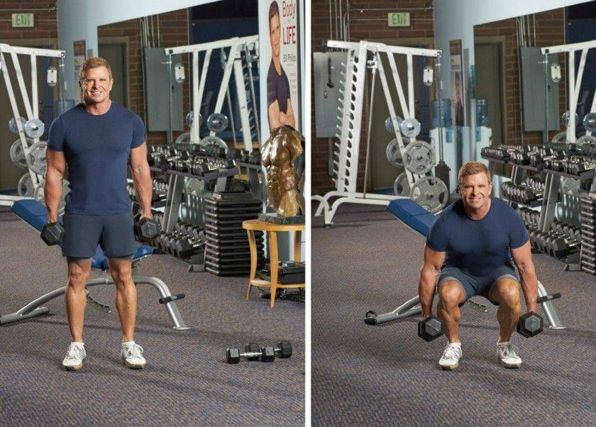 - Приседания с гантелями — 3 подхода по 12-15 повторов;
