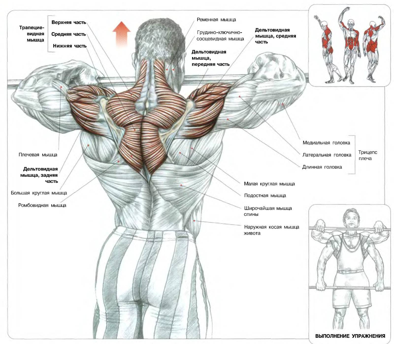Упражнение создает рельеф мышц, отделяет трапецию от дельты. В работе сокращаются средняя и верхняя трапеции, средние дельты. Локти должны двигаться только в плоскости туловища, смотреть строго в стороны. Ширина хвата должна быть меньше ширины плеч, необходимо следить за осанкой и положением головы. Мышцы пресса должны быть напряжены во время всей работы.