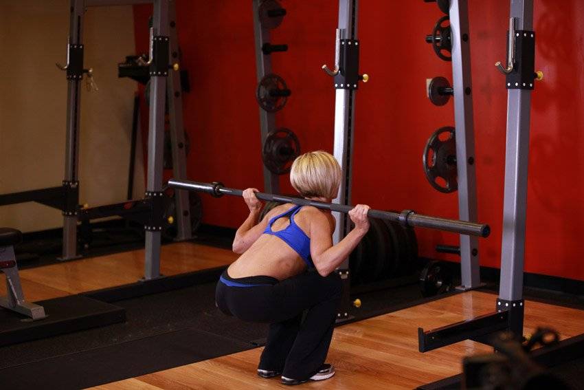 Приседания в смите. Техника приседаний в тренажёре Смита очень похожа на обычные приседание, но есть и существенные отличия. Для начала вам необходимо установить гриф на удобной для вас высоте (она должна быть такой, чтобы гриф располагался чуть ниже плеч). Далее вы подсаживаетесь под гриф, берёте его хватом сверху и выпрямляетесь. Ноги ставите чуть шире плеч и на 20-25 см дальше, чем ваши бёдра. Таз отводится назад, спина должна быть строго перпендикулярна полу. Делаете глубокий вдох и садитесь, отводя таз назад. Садиться необходимо чуть ниже параллели. На выдохе вытолкните себя вверх только усилием ног и ягодиц.