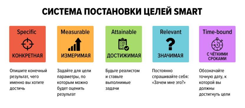 SMART – это методика, которая подходит как для личных целей, так и для бизнес-проектов. Название этого инструмента представляет собой аббревиатуру, состоящую из первых букв английских слов: Specific, Measurable, Attainable, Relevant и Time-bound. Разберемся, что они означают.