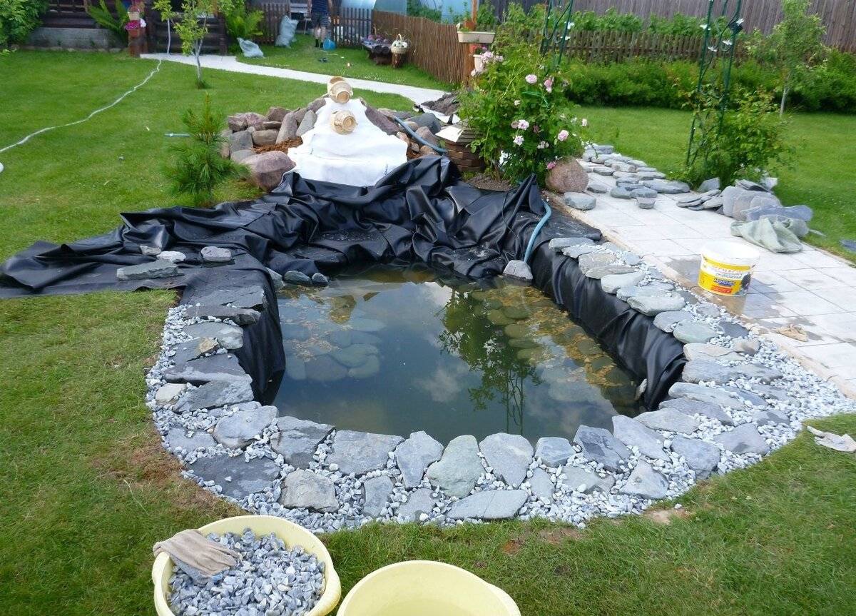 Когда у вас получится полиэтиленовый резервуар, зафиксируйте его края – лучше всего придавить их крупными булыжниками – они защитят от ветра, скроют излишки пленки и придадут натуральный, природный внешний вид. На дно тоже можно положить груз – песок, округлую гальку (избегайте острых стройматериалов).