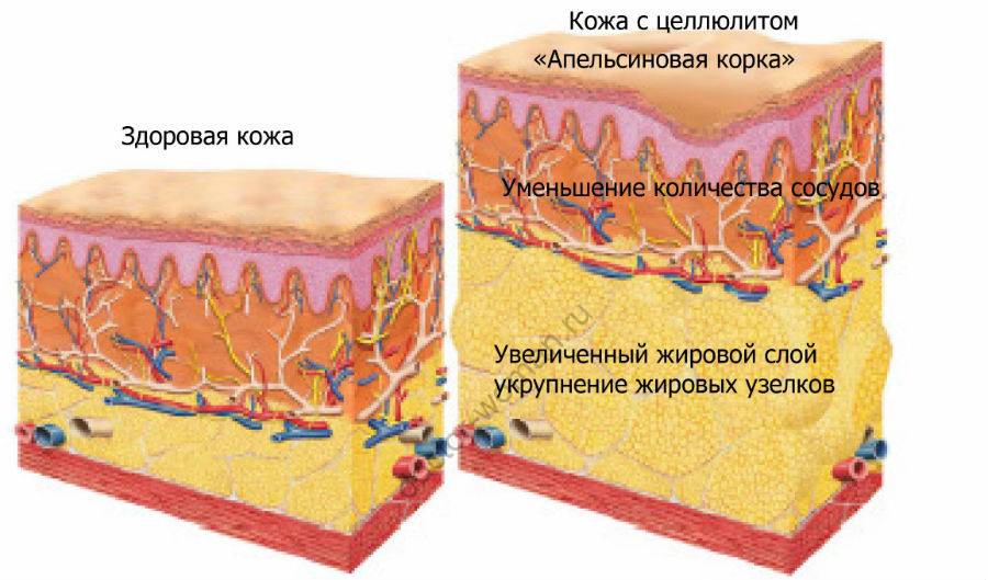 Такое в основном происходит из-за того, что человек начинает набирать вес. Он толстеет, а клетки тем временем увеличивается. Их количество не меняется, но они разрастаются, давят друг на друга, мешая крови «передвигаться» по нашему телу. Каждая клетка начинает набирать вес, как и человек, следовательно, со временем ей становится сложнее выполнять свои функции, и она начинает всасывать все токсины и жидкость. После таких изменений наши клеточки начинают выпирать наружу, образовывая на коже апельсиновую корку.
