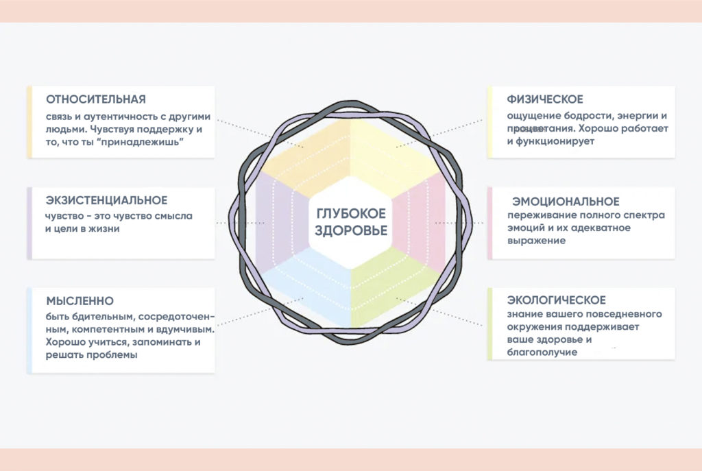 Существует шесть областей или сфер глубокого здоровья: физическая, эмоциональная, экологическая, мыслительная, экзистенциальная и относительная.